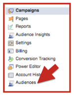 To set up a remarketing pixel, log into your advertising manager and click on Audiences, as shown below.