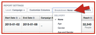 The best way to analyze age group and gender performance is to log into your ad manager and click on Reports.